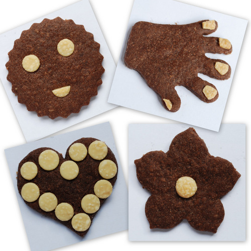 Um das letzte Stück Teig, das ich nicht mehr ausgestochen habe, hat sich meine Tochter gekümmert. Sie dachte sich alle möglichen Formen aus: Loks und Autos (mit Schokoladenpunkten als Räder), Smileys und vieles mehr. Das Handplätzchen mit den Schokoladenfingernägeln brachte mich zum Schmunzeln! =) Hier sind einige Kostproben, die ich rechtzeitig fotografieren konnte, bevor sie in gierigen Mündern verschwanden...